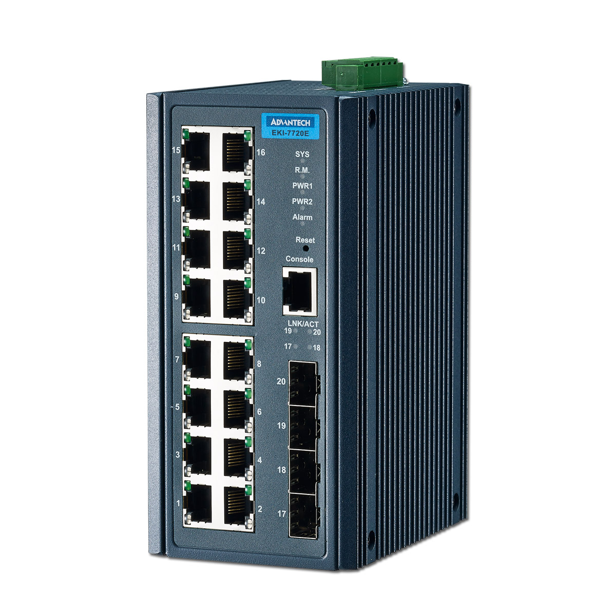 EKI-7720E-4F/4FI unterstützt 16 Fast Ethernet Ports und 4 SFP (mini-GBIC) Ports. Er bietet den Anwendern eine große Anzahl von Ports, um viele Geräte anzuschließen. Außerdem ist er mit der Advantech IXM-Funktion ausgestattet, die den Benutzern eine schnelle Bereitstellung ermöglicht und Ingenieuren viel Zeit und Kosten spart. Die EKI-7720E-Serie unterstützt auch NMS, um IT-Managern bei der Netzwerkwartung und Fehlervermeidung zu helfen. Schließlich ist die EKI-7720E-Serie mit X-Ring Pro ausgestattet, das eine extrem schnelle Wiederherstellungszeit von weniger als 20 ms erreichen kann, um die Netzwerkstabilität zu gewährleisten. Der Switch verfügt außerdem über einen weiten Betriebstemperaturbereich von -40° bis 75°C (EKI-7720E-4FI).